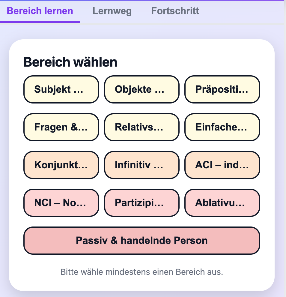 Das Lapicida Satzquiz trainiert Satzglieder Latein direkt an echten lateinischen Sätzen — nicht mit Karteikarten, sondern interaktiv im Text. Du markierst Satzglieder direkt im Satz. Bei jedem Fehler erklärt Lapicida genau, was falsch war und warum.